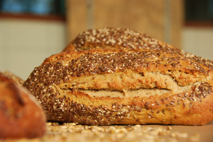 Pan artesanal elaborado a base de harina integral de trigo , fermentacion lenta de masa madre, semillas de Linaza, Ajonjolí en toda la masa, agua y sal marina. No contiene ningún tipo de grasa, mejorador químico o ingrediente artificial